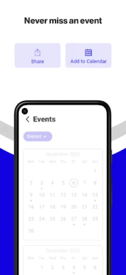 NEVER MISS AN EVENT The event section shows a list of events throughout the district. Users can add an event to your calendar to share the event with friends and family with one tap.