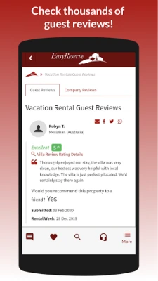 Reviews are one on the most important factors when booking. Thousands of previous Easyreserve clients have uploaded reviews of the holiday villas in which they have stayed - many with their own photos - and these reviews are all available to view in the app.